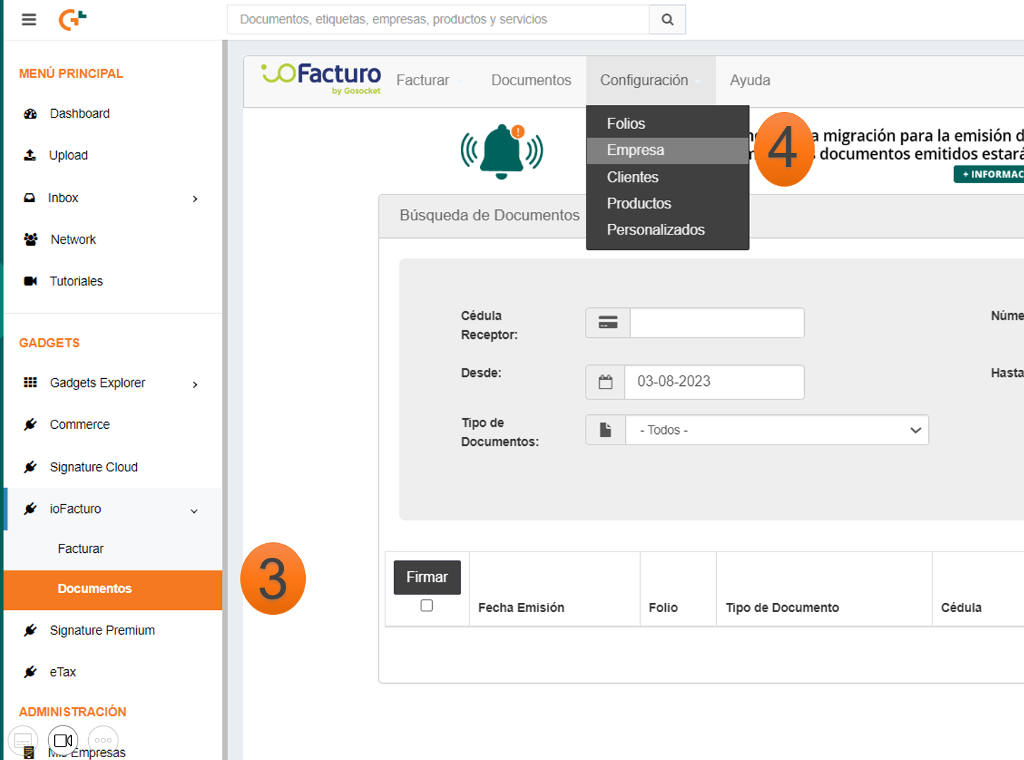 3. In the main menu, click on ioFacturo – Documents (Documentos).