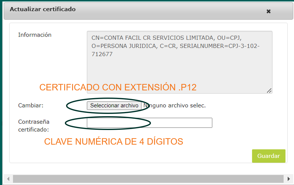 5. In the pop-up window, locate the section corresponding to the Cryptographic Key (Llave criptográfica). There, you must upload the .p12 file provided by the Ministry of Finance, along with the previously defined 4‑digit password.