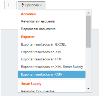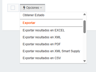 The user must open the Options (Opciones) menu and select the preferred format (Excel, PDF, XML, among others) to export the report. It is important to note that the platform does not issue a notification after this action is performed.