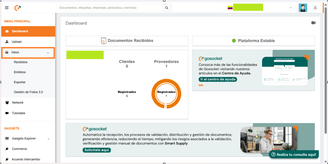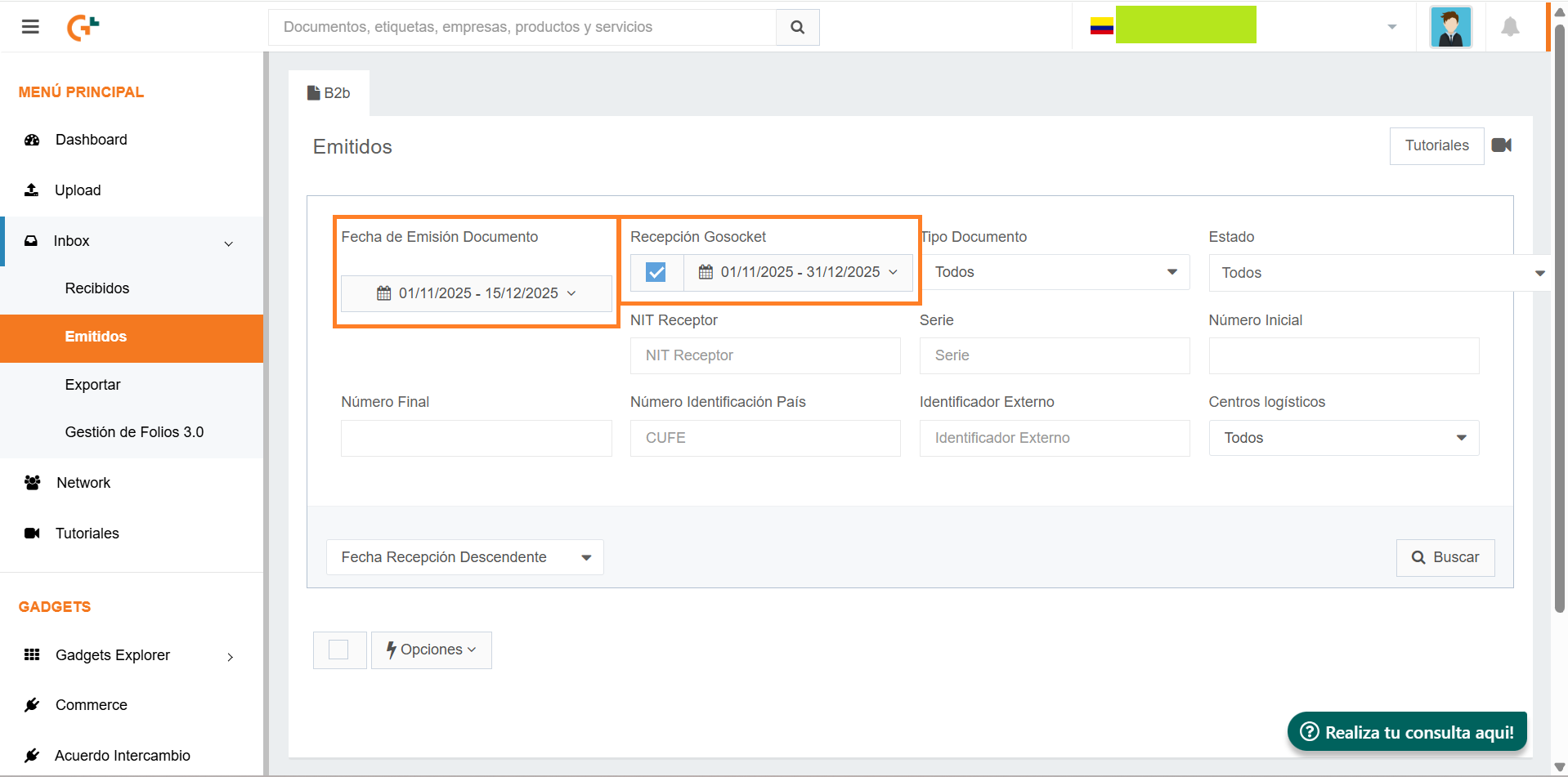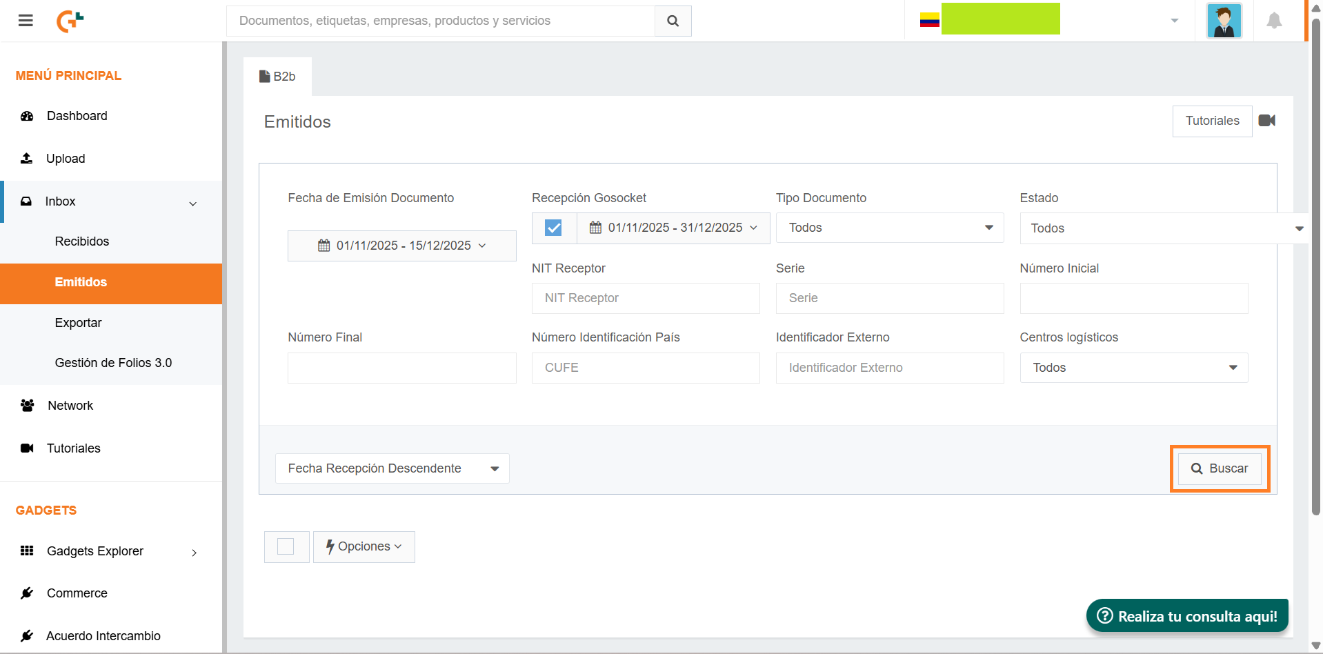 In the navigation bar located on the left side of the screen, the user must identify the Inbox section and choose the category required for the report: Issued Documents (Emitidos) or Received Documents (Recibidos).