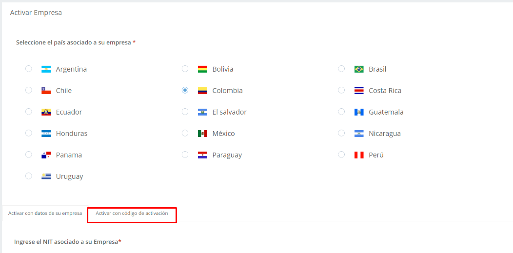 Note: If the company is based in Colombia, you must complete the activation without including the verification digit in the NIT.