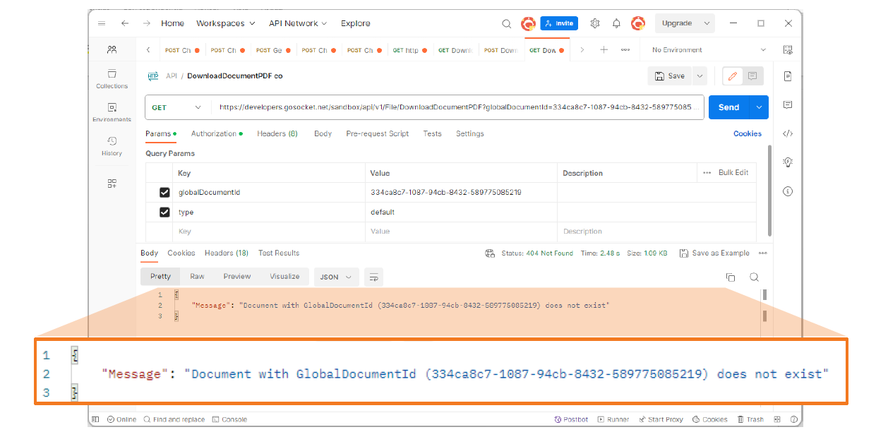 The method requires the presence of a valid GlobalDocumentId. If this identifier is missing or not provided correctly, the system will return an error message, indicating that the request cannot be processed without a unique document identifier.