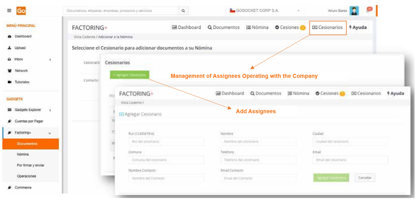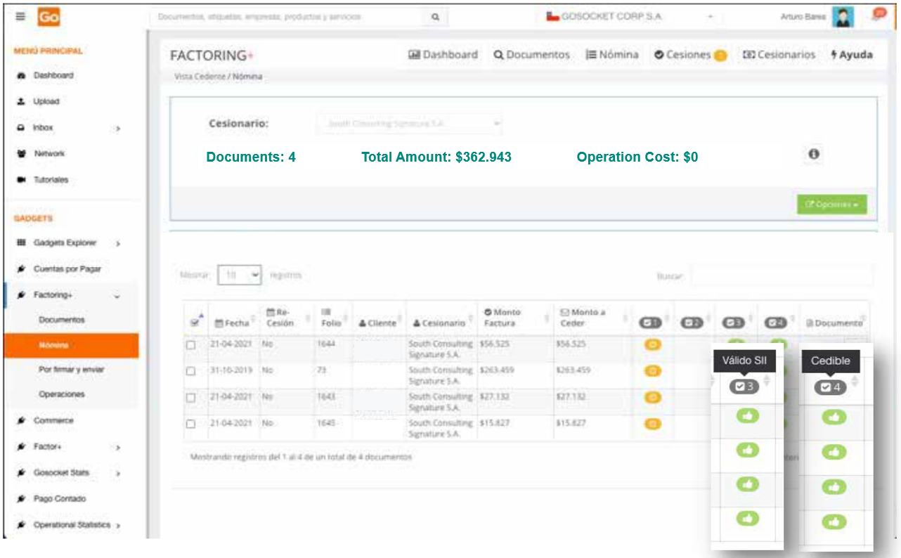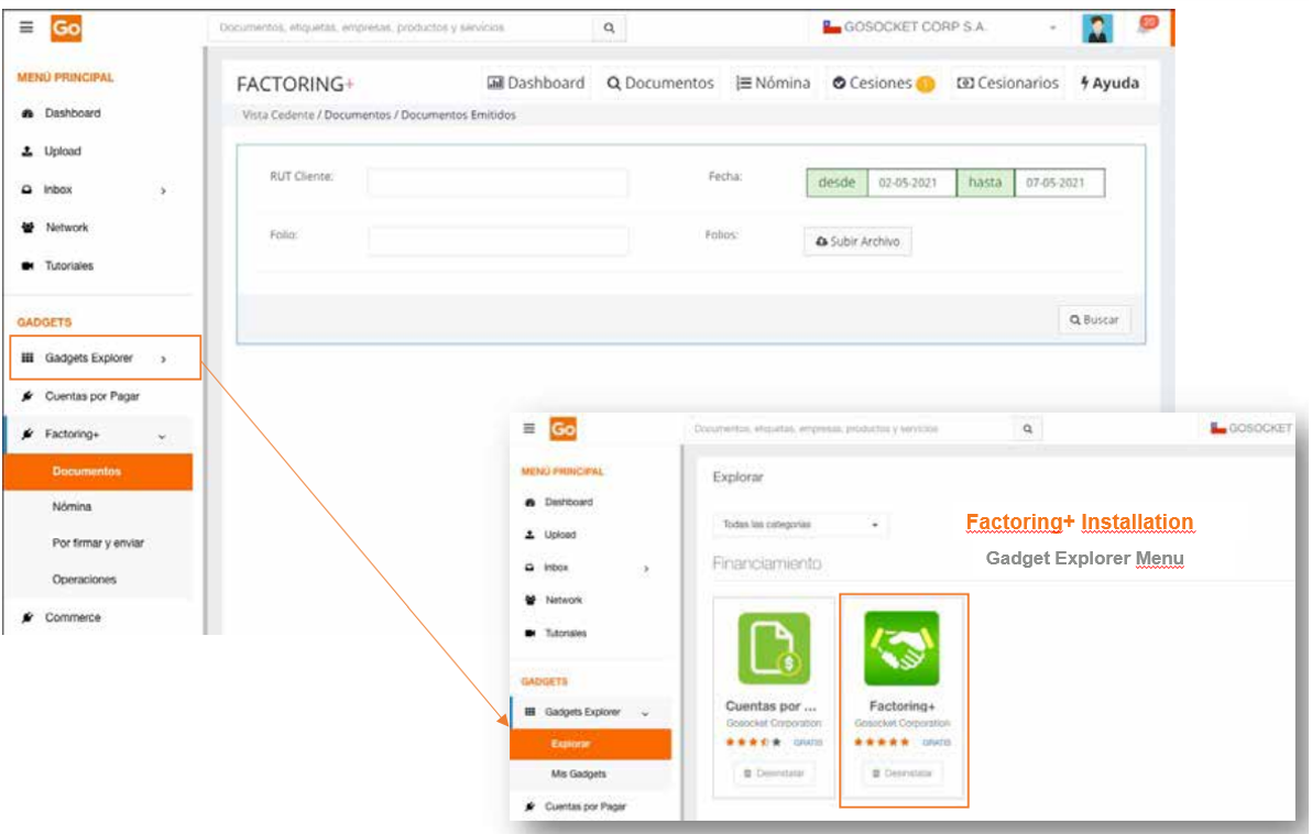 To use Factoring+, it is necessary to first install the application from the Gadget Explorer menu available on the Gosocket portal.
