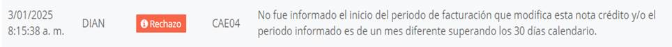 The CAE04 rejection is generated for Credit Note documents (code 91). It occurs when the credit note does not reference an invoice, and the start period is either not provided or exceeds 30 days.