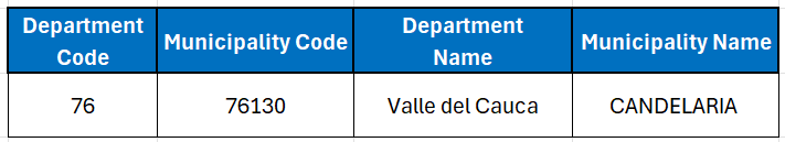 However, when consulting DIAN’s municipality table 13.4.3, a mismatch is identified, as the correct code for the municipality of "Candelaria" is 76130.