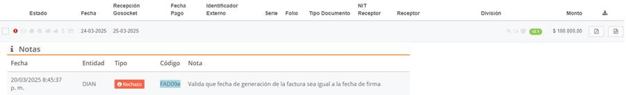 To correct the FAD09e rejection, it is necessary to adjust the invoice issuance date so that it matches the signature date. In this case, the issuance date must be modified to March 25.
