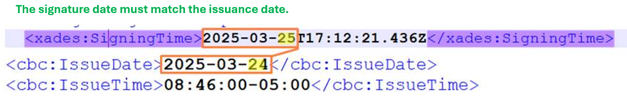 Upon reviewing the XML file, it is observed that the document was signed on March 25, but has an issuance date of March 24, which causes the rejection.