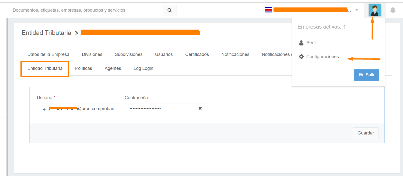 - Navigate to the Tax Entity (Entidad Tributaria) tab within the settings section.