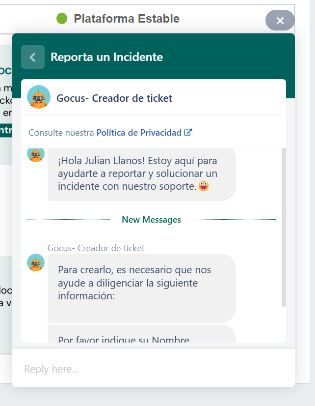 - Bot de ayuda dentro del Portal Gosocket->Reportar un Incidente