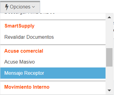 3. Abrir el menú de Opciones y localizar la sección Acuse Comercial.