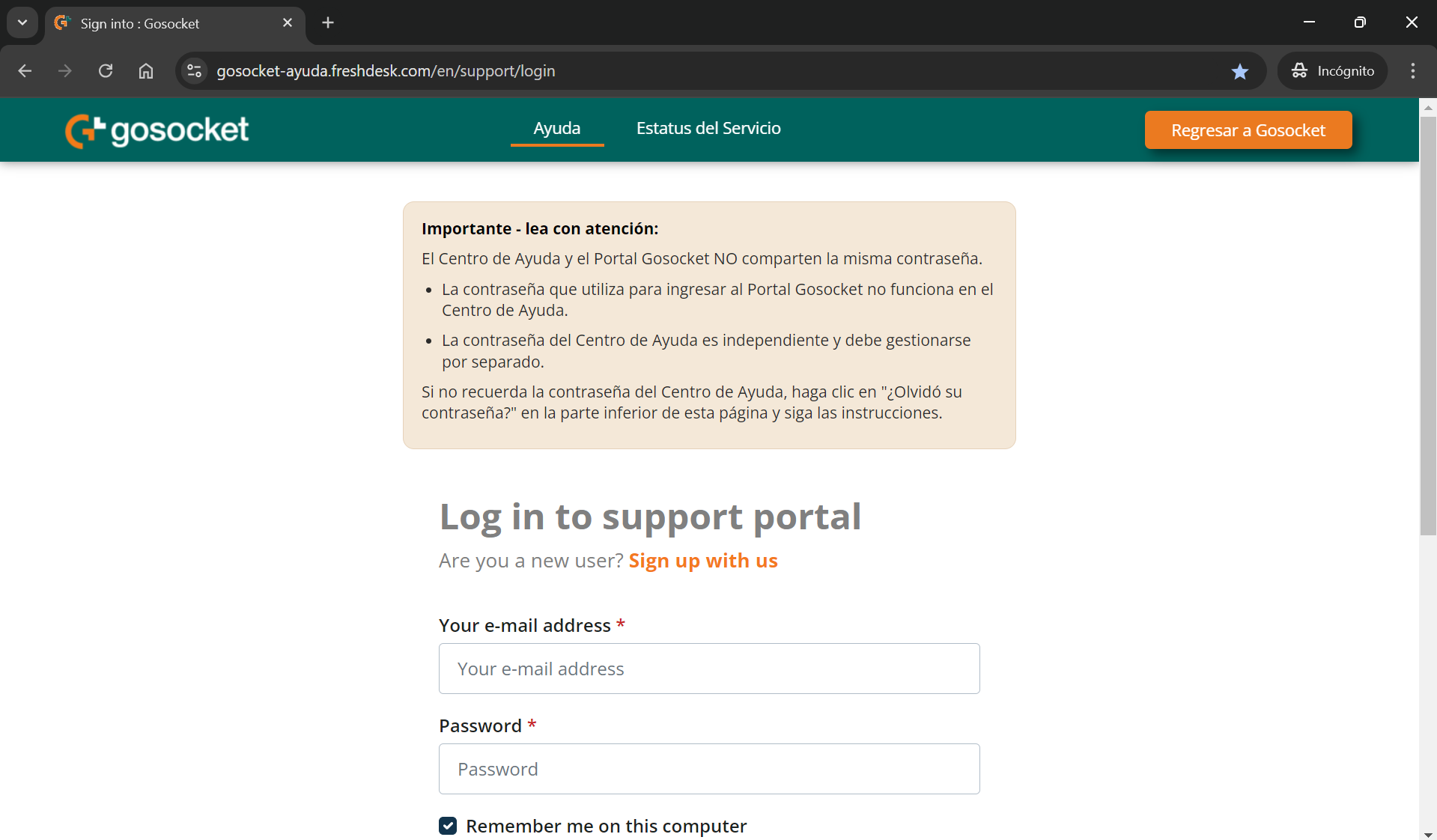 - La contraseña que utiliza en el Portal Gosocket no funciona en el Centro de Ayuda.